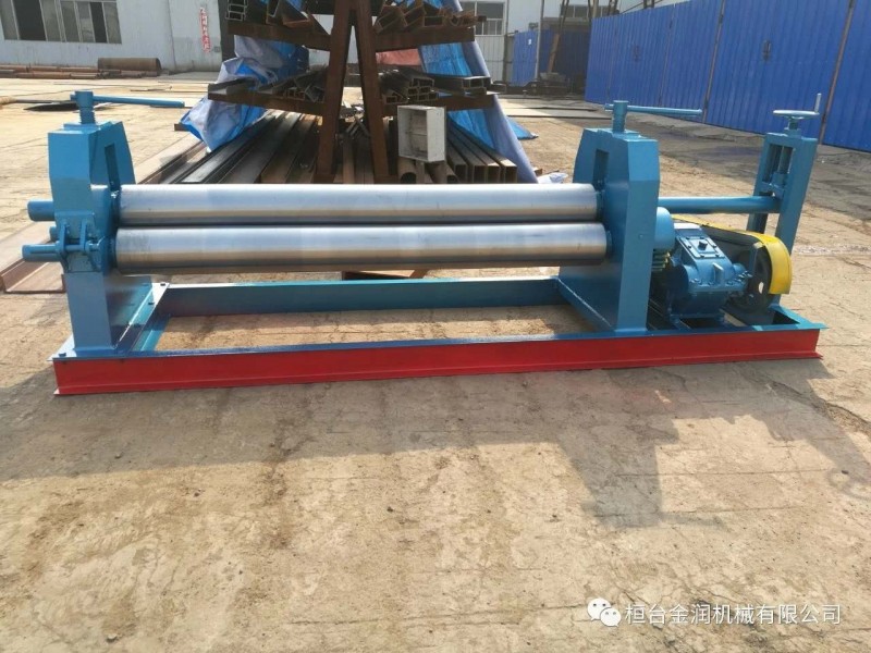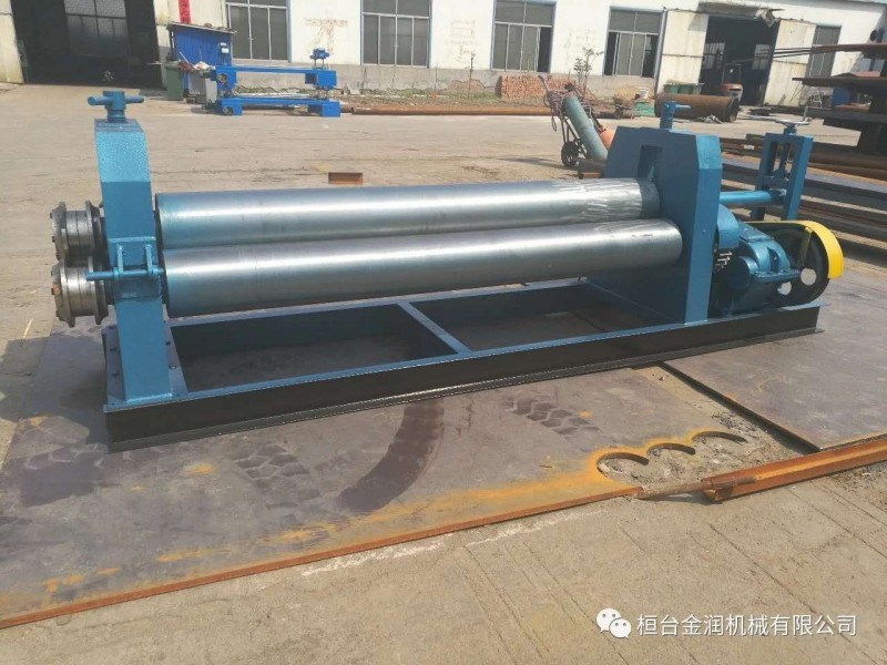 半自動卷板機,該機結構式為三輥對稱式,上輥在兩下輥中間對稱位置作垂直升降運動,通過人工擰動絲桿使上輥垂直升降,兩下輥作旋轉運動,通過減速機的輸出齒輪與下輥齒輪嚙合,為卷制板材提供扭矩。上輥可分離取料手動升降起輥。